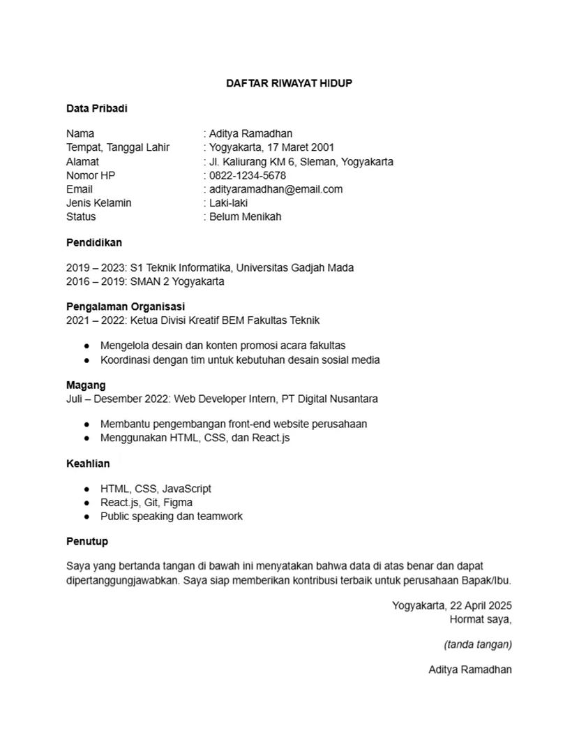 Berikut contoh daftar riwayat hidup yang dirancang khusus untuk lulusan baru, lengkap dengan format yang dapat kamu modifikasi sesuai kebutuhan.