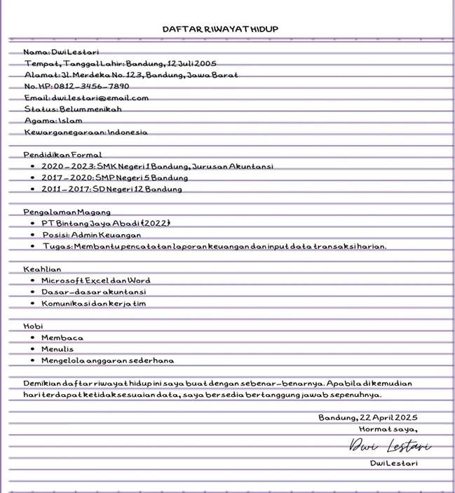 Berikut ini merupakan contoh daftar riwayat hidup tulis tangan yang cocok untuk lulusan SMK yang belum memiliki pengalaman kerja yang banyak.