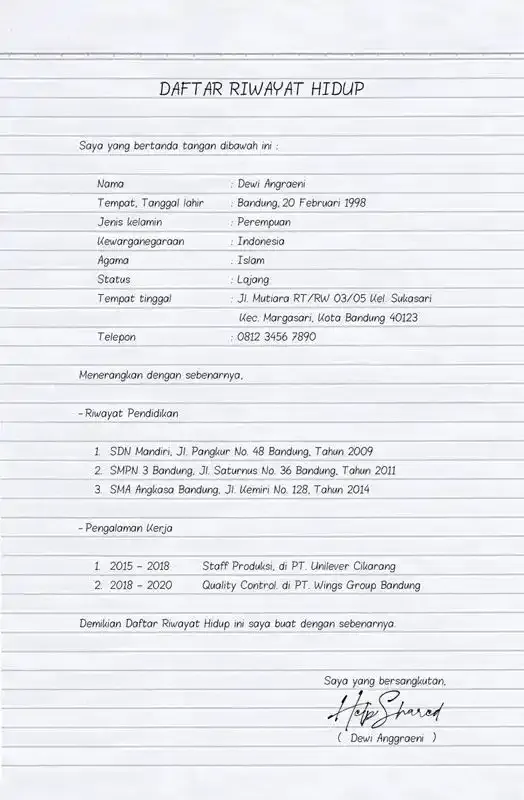 Di bawah ini adalah contoh daftar riwayat hidup yang dibuat secara manual yang bisa kamu gunakan sebagai acuan ketika melamar secara langsung.